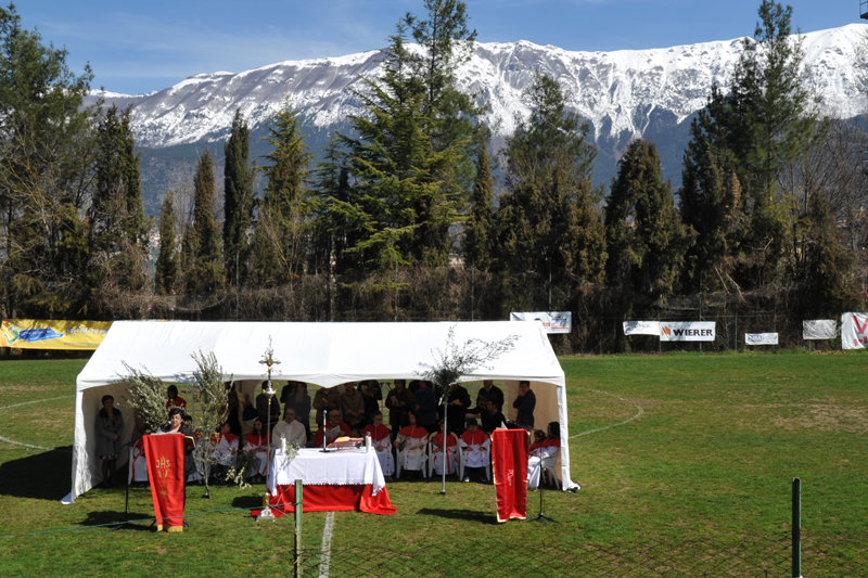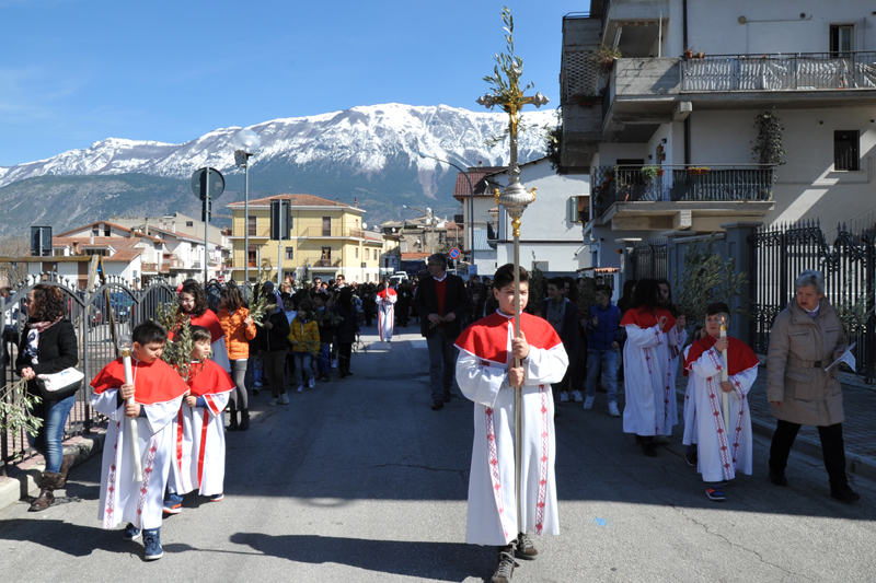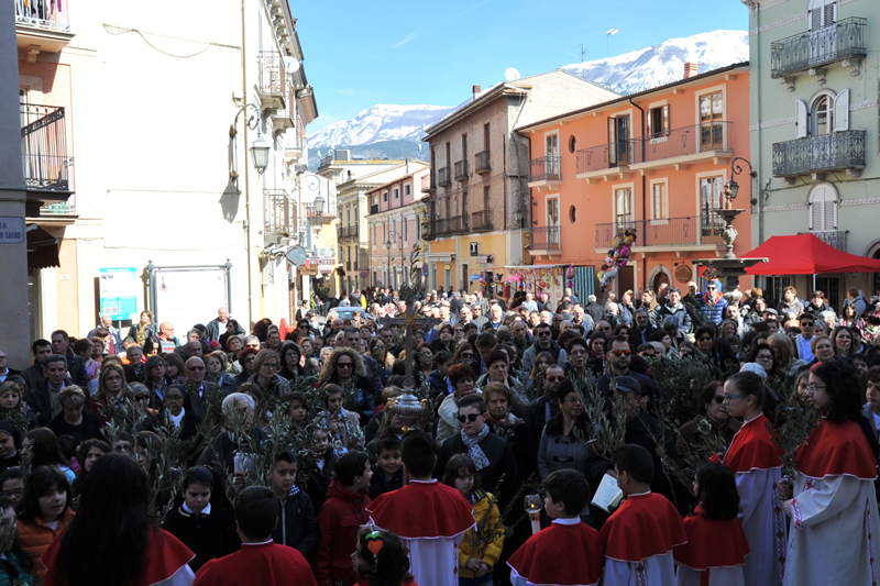 Giornata di sole splendente quella del 20 marzo 2016: la vista fantastica del Morrone ancora coperto di neve, gli spalti del Campus gremiti di persone con rami d’ulivo: questo lo scenario della Domenica delle Palme a Pratola.
