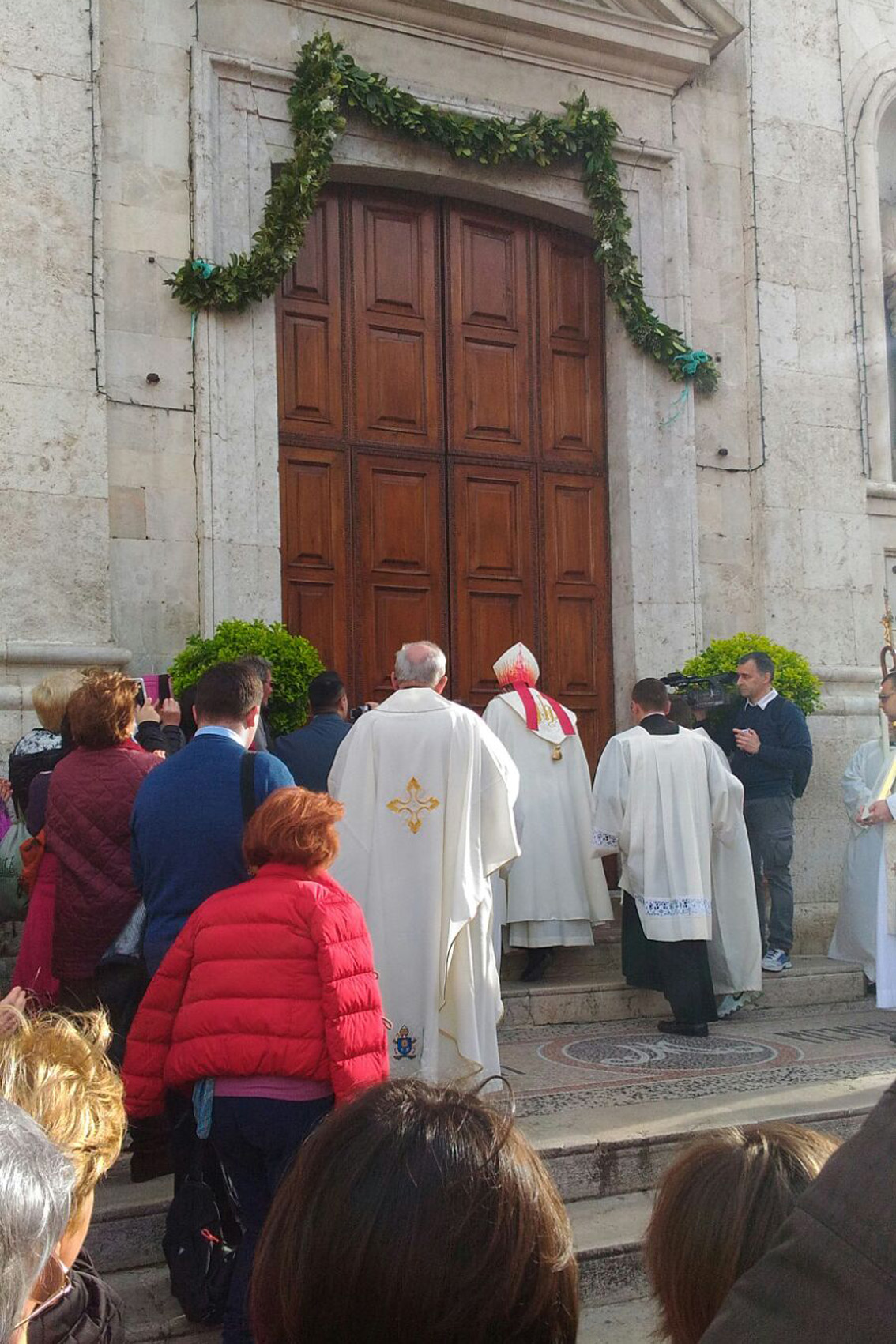Porte chiuse, santuario deserto, piazza gremita di gente in attesa. Il Vescovo ha solennemente aperto la porta del Santuario che per poche ore è stata la “Porta della Misericordia”, come affermava un grande cartello posto all’ingresso. Tutti hanno attraversato la Porta e il Santuario si è riempito come nelle grandi occasioni.