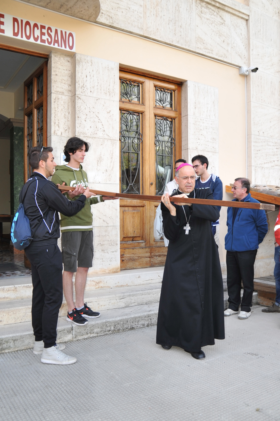 Con la croce sulle spalle, i giovani sono partiti dal Centro Diocesano ed hanno percorso la strada tra canti e preghiere. Arrivati alla chiesetta della Madonna della Neve, il corteo è diventato vera processione che si è snodata fino al Santuario.
