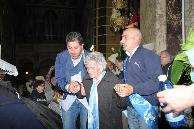 Come tradizione, i pellegrini hanno percorso la navata del Santuario in ginocchio, per arrivare fino all’altare maggiore, a baciare il monogramma mariano intarsiato in marmo, sotto la mensa. E si sono succeduti più di trecento fedeli, ognuno con un volto, una storia, una domanda.
