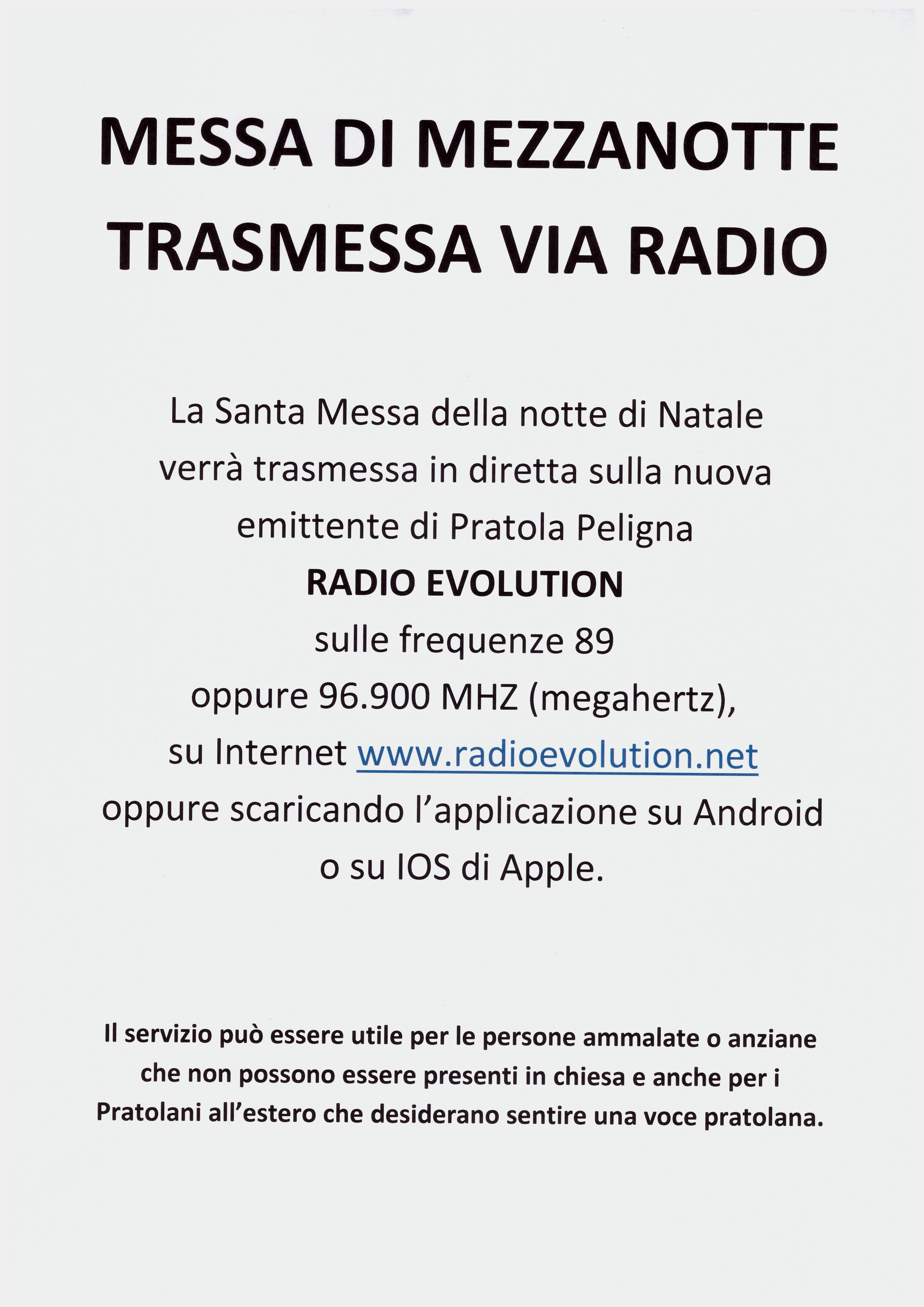 Per coloro che desiderano partecipare alla celebrazione della Messa di Mezzanotte di Natale, ma non potranno essere presenti, perché ammalati o lontani, viene in soccorso la tecnologia. Grazie a Radio Evolution le barriere saranno superate.