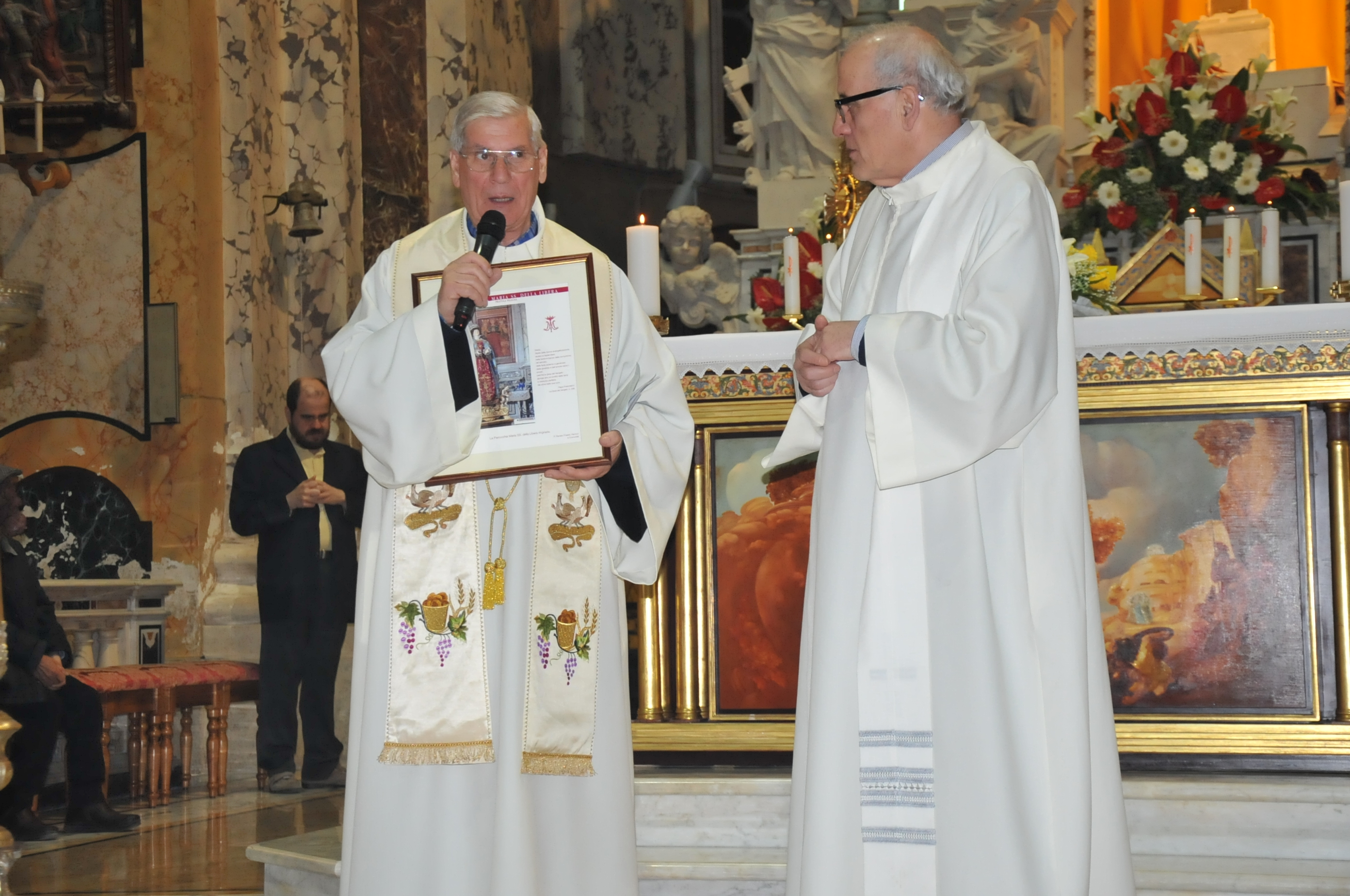 Padre Bonaventura ringrazia per il dono ricevuto in ricordo della serata: la riproduzione del quadro della Madonna della Libera