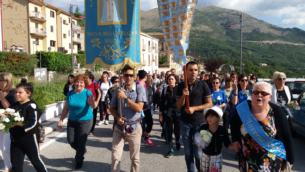 Si è ripetuto anche quest’anno, 2 settembre, il consueto Pellegrinaggio ad Anversa degli Abruzzi di numerosi pratolani desiderosi di partecipare alla Festa della Madonna della Consolazione. Un gruppo di oltre 40 pratolani è partito di buon mattino (alle 5) e ha percorso a piedi la notevole distanza che ci separa da Anversa. Altri sono arrivati in pullman. Altri ancora con le loro auto. Verso le 9.30 ci siamo ritrovati tutti all’ingresso del paese. Quando la banda e le Autorità cittadine sono venute ad accoglierci, con loro ci siamo recati nella Chiesa dove è stata celebrata una santa Messa.