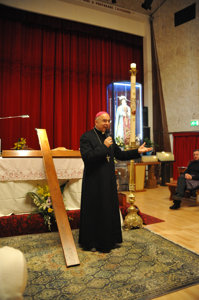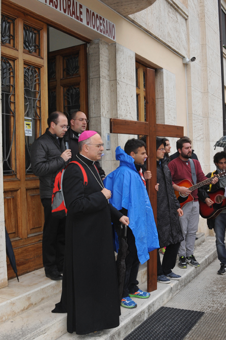 Qualche chilometro prima dell’arrivo, c’è stato l’incontro con coloro che sono andati incontro ai giovani partendo da Pratola. Insieme il gruppo è giunto davanti al Santuario, in questo tempo chiuso per i lavori di consolidamento della volta. Il Vescovo ha parlato brevemente, mettendo in guardia contro i pericoli cui è esposta la gioventù: droga, alcool, cyber-bullismo.