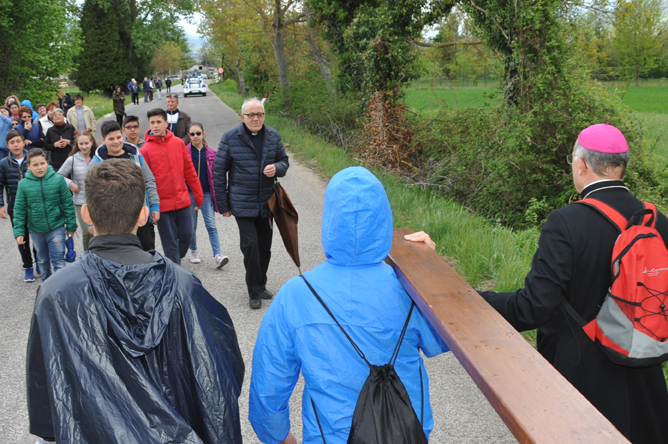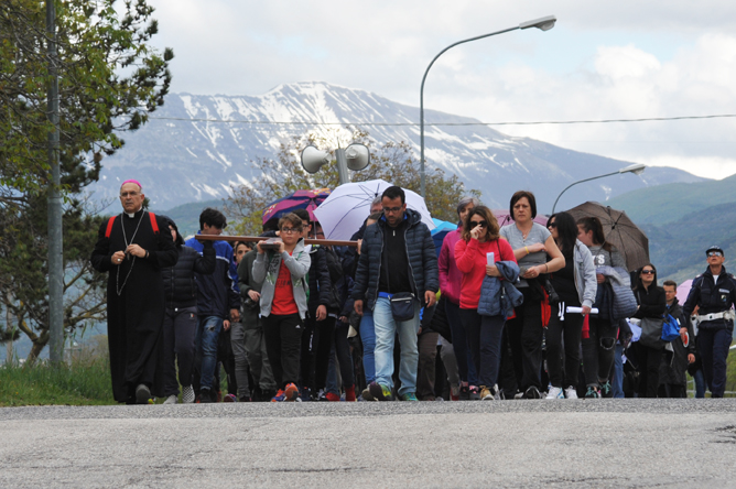 Equipaggiati per resistere alla pioggia, che si è poi fatta presente, anche se in misura non preoccupante, pregando e cantando si sono mossi dietro la croce, che apriva il cammino.