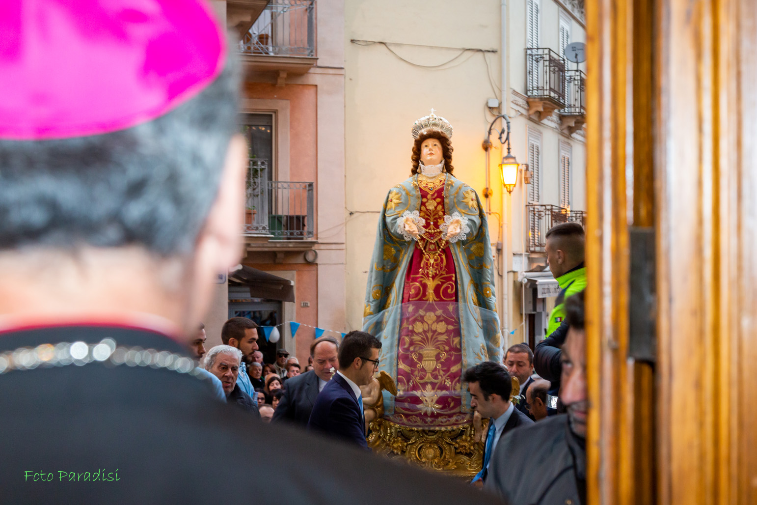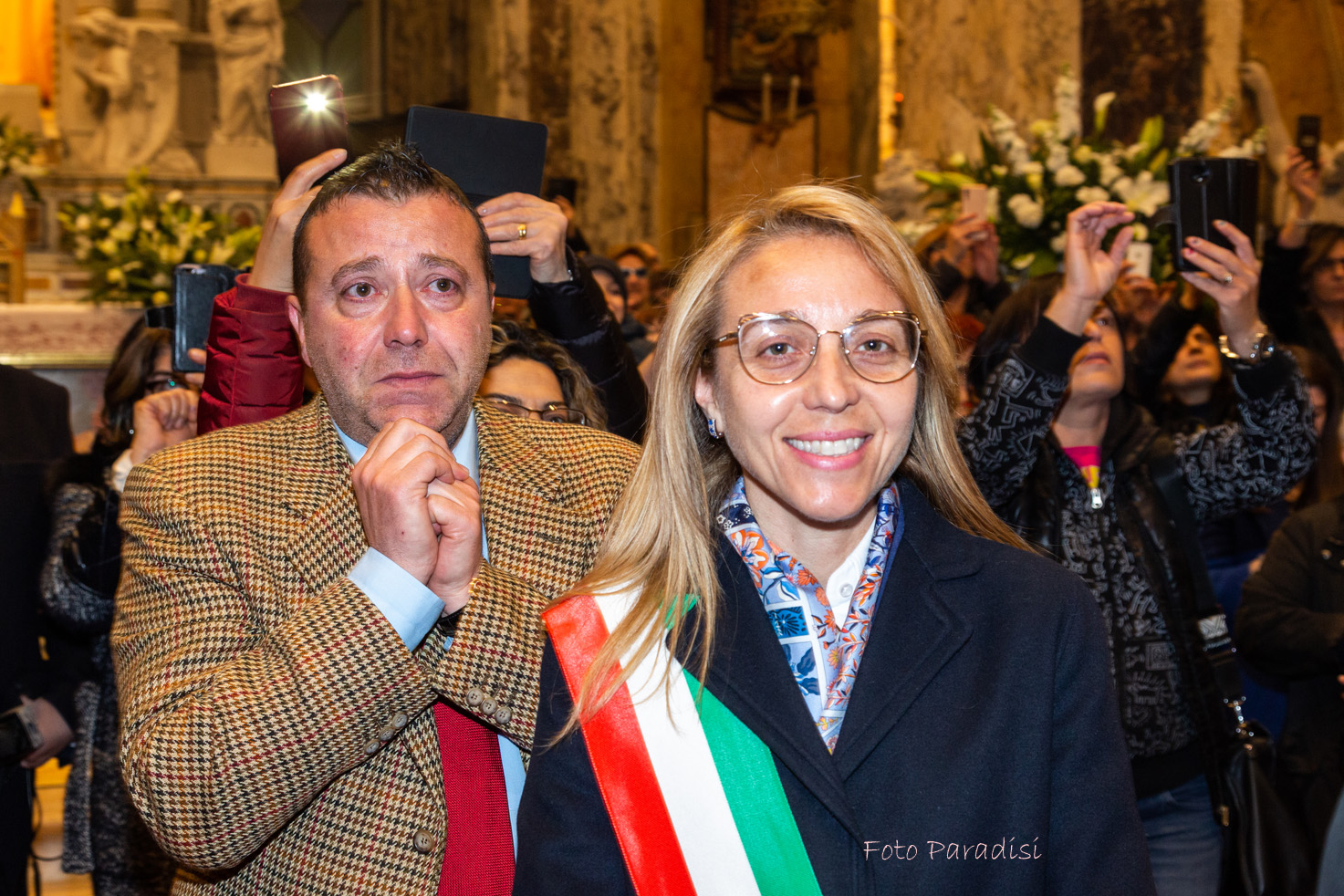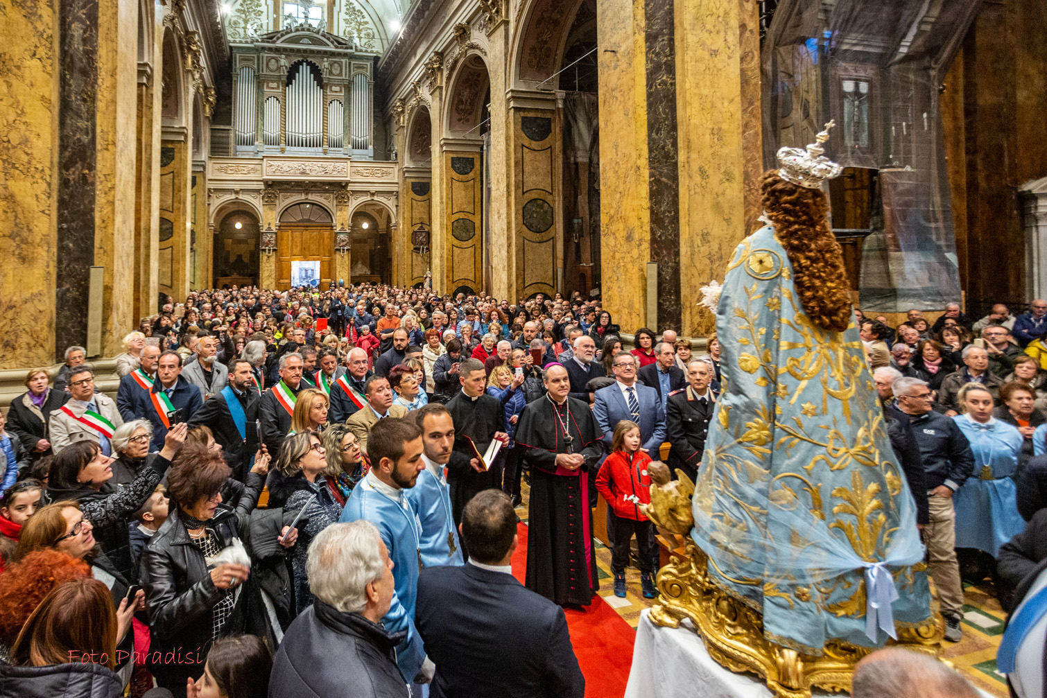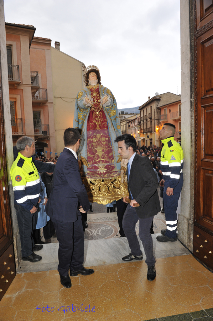 E si spalanca il portone della Chiesa ed entra, portata dai collaboratori del Santuario, la statua della Madonna della Libera. Era stata per due anni e mezzo fuori di casa, nomade come tutta la comunità cristiana. Ora rientra solennemente, accolta dagli applausi e dalle lacrime dei numerosi fedeli che sono intervenuti e dal canto “Evviva Maria”. Fa fatica ad avanzare, stretta nella ressa della gente. Quando finalmente viene posta davanti all’altare, il Vescovo la incensa e recita, a nome di tutti, una preghiera. Poi l’omaggio canoro dei pratolani Maurizio Pace e Lisa Capano che, accompagnati all’organo dal Maestro Italo Di Cioccio, anch’egli di origini pratolane, cantano l’Ave Maria.