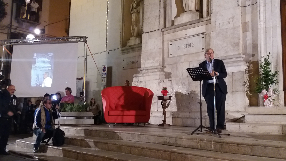 Vittorio Sgarbi. Invitato dall’amico Silvio Formichetti, è poi arrivato Vittorio Sgarbi tra gli applausi della folla. Con la sua indubbia capacità oratoria, ha intrattenuto i presenti con una lezione sugli aspetti architettonici di alcune delle principali chiese del nostro territorio, in particolare di Sulmona: l’Annunziata, la Tomba, la Cattedrale, Santa Chiara. Ha poi parlato dell’Abbazia Celestiniana, della Chiesa di San Francesco di Castelvecchio Subequo, della Cattedrale di Corfinio. Ha poi chiuso il suo discorso con il nostro Santuario, affermando che è una delle principali opere ottocentesche dell’Abruzzo. Ci auguriamo che questo serva per rivederlo presto aperto!